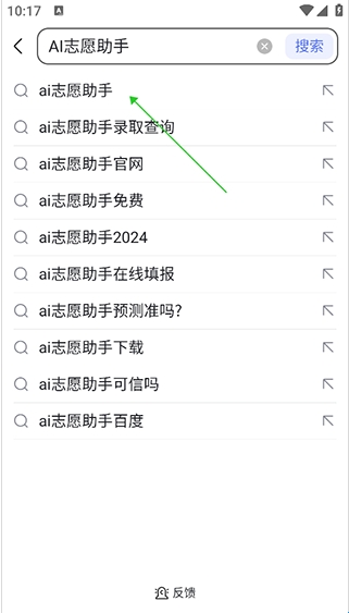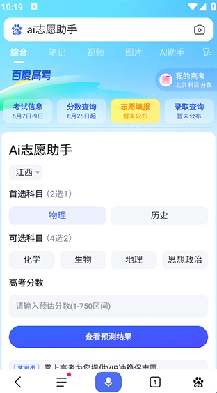 直接在百度App中的搜索框中输入“AI志愿助手”,然后就可以在弹出的下拉选项框中点击【AI志愿助手】