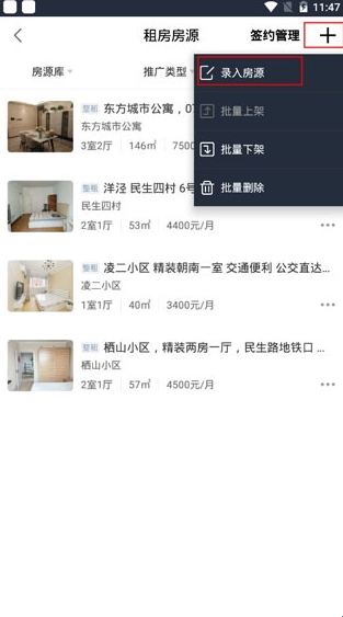 点击右上角"+",选择录入房源。