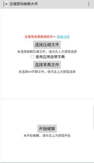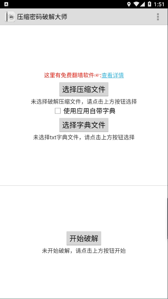 二、点击字典暴力破解,选择需要破解的压缩文件与是否使用应用自带字典;