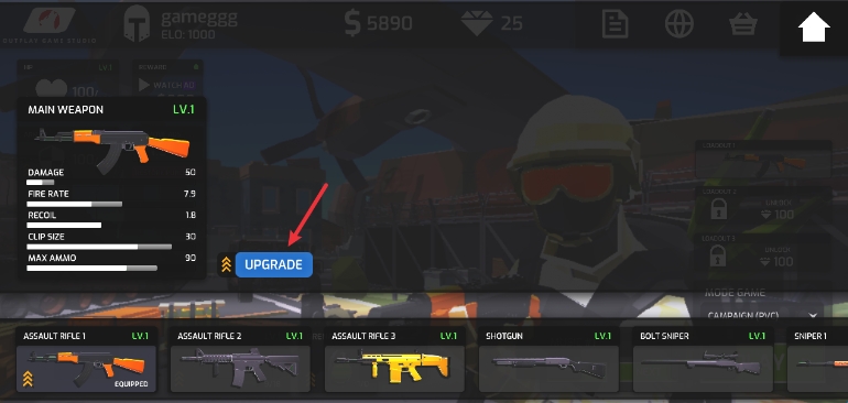 1、主界面点击下方的武器,点击对应的类型即可更换。