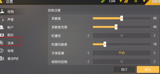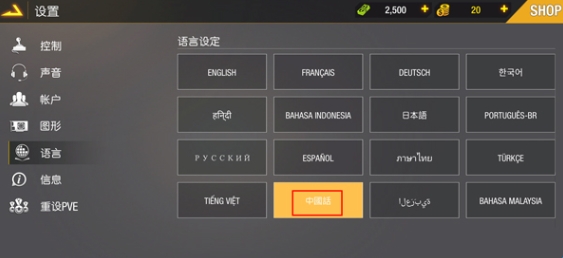 2、进入到设置页面,这里有控制、声音、账户、语言等游戏设置选择,点击选择语言;