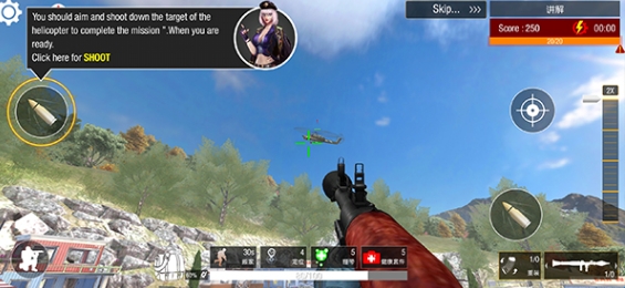 2、开镜之后我们就可以看到远处的敌人了,然后我们进行瞄准点击左上角或者右下角的开火键位射击;