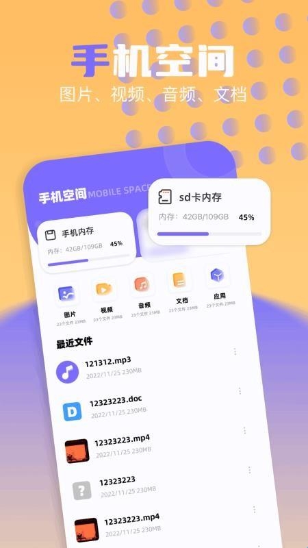 便捷管理 APK文件,可收藏重要 APK ,查看导出记录。实时展示存储空间使用情况,并分类呈现图片、视频、文档等占用空间及文件数量。