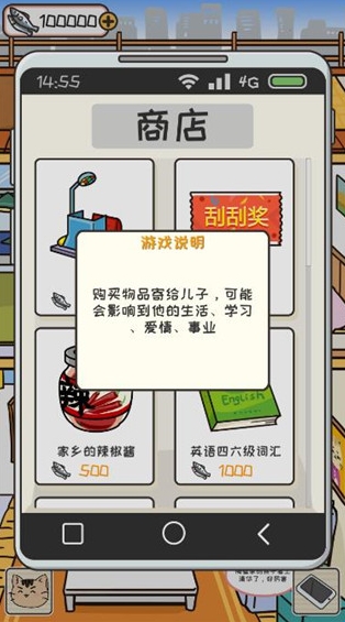 在商店即可购买物品,每次邮寄东西都会影响他的结局;