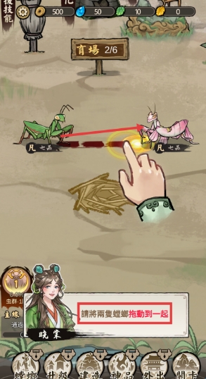 2、在育场场景中,按照提示将两只螳螂拖动到一起,以此触发繁殖相关的养成操作。