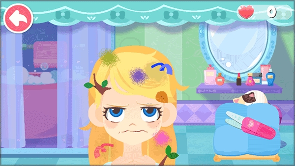5、清洁头发:轻柔搓洗公主的头发,打开花洒冲走。吹风机“呼呼”吹干水珠,再梳一梳头发。