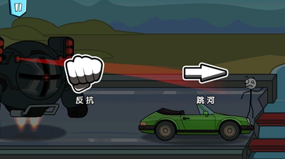 1、玩家打开火柴人历险记游戏,点击开始,游戏中火柴人被一个机器人追到断桥边,玩家可选择反抗或跳河,不同的选择有不同的结局;