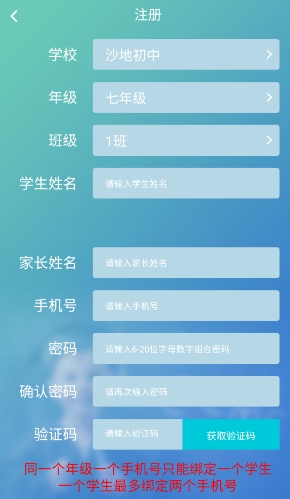 注意:同一年级一个手机号只能绑定一个学生,一个学生最多绑定两个手机号。