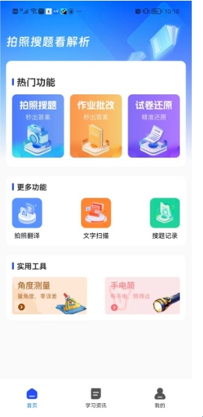 在软件首页中提供拍照搜题、作业批改、试卷还原、拍照翻译、文字扫描以及搜题记录等功能;