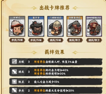 5、羁绊解析:3骑兵羁绊带来全队攻击与移速加成,3斥候羁绊则赋予全体单位吸血能力,显著增强续航。步兵羁绊附加额外生命值,多次触发御林铁鞭重骑兵黄金龙枪次数。