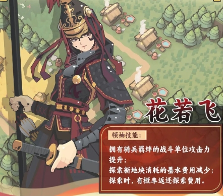 1、花若飞:拥有骑兵羁绊的战斗单位攻击力提升;探索新地块消耗的墨水费用减少;探索时,有概率返还探索费用。
