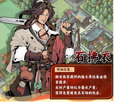 1、石拂衣:拥有侠客羁绊的战斗单位暴击伤害提升;石材产量转化为墨水产量;获得免费建造采石场的机会。