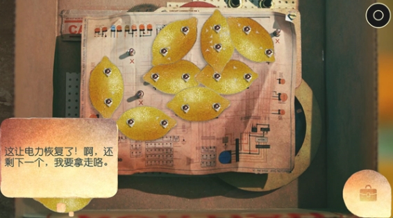 3、进入大门后,就可以在城门入口进行探索,在左侧有一个配电箱,需要使用道具进行解谜(连线)。进去的房间里,可以看到房间里有柠檬树,上面全是柠檬,点击全部收集。同时边上的黄框有电路图(就是用在外面的配电箱),查阅一下后到外面的配电箱使用电路图将柠檬按照对应位置放好就可以了。