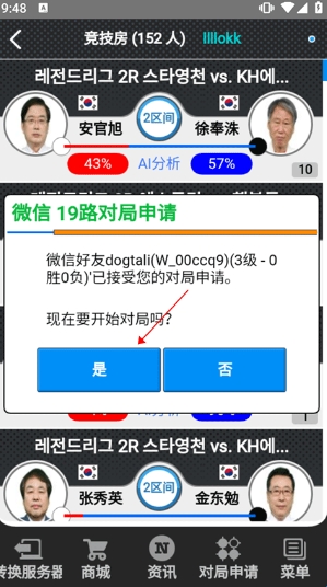5、这时我们就会收到好友的同意对局申请,点击是即可开始对局