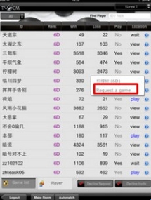 2)从用户列表申请:先切换到用户列表,点击对应的蓝色箭头按钮,点击“Request a Game”发送对局申请