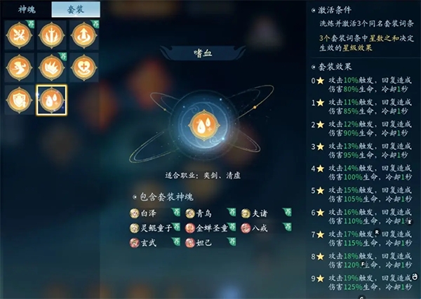 4、嗜血,作为防御位替补的一块嗜血神魂,攻击的%10触发回复造成伤害的%回复,首先建议这块神魂适用于群攻大的职业,比如奕剑的(茬茬茬茬)当然大家知道我说的是那个技能哈,奕剑唯一的爆发技能→职业的门面吃饭技能。清虚的群体控制技能,大金刚的八米长的搅屎棍技能。注重这快神魂的冷却效果只有一秒。当然次块神魂充值越多效果越大。喜欢玩暴力的玩家可以直接选他。
