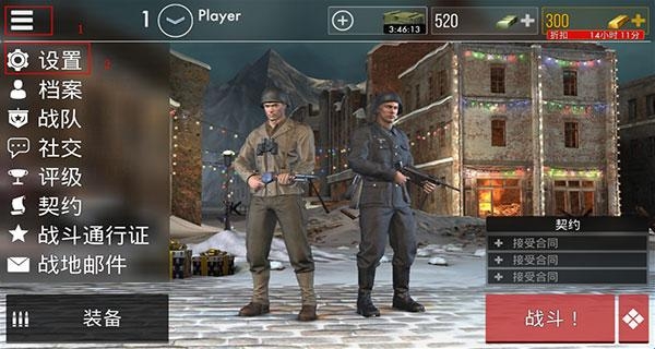 1、下载安装好二战英雄,运行游戏后登录进入下图界面,在左上角有三杠标志,选择设置;
