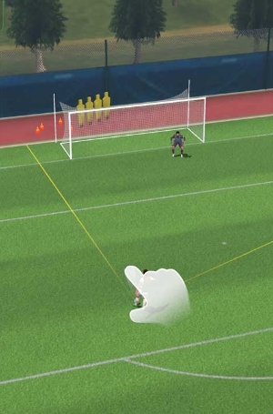 1、游戏的开始会有简单的新手指导,玩家需要根据屏幕上出现的三角区域,制作出最好的踢球抛物曲线,确定好抛物曲线之后,就在三角区域用手指滑动一条白色的实线,这样后面运动员就会根据这条曲线去踢球过去。