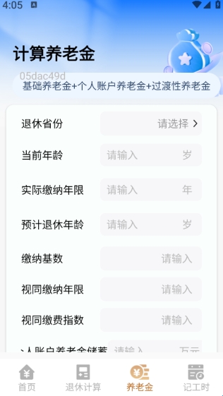 点击进入养老金页面,输入自己的相关数据就可以计算养老金。