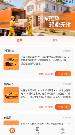 在搬家页面中提供了很多不同的车型,你可以随时根据自己所需进行一键下单;
