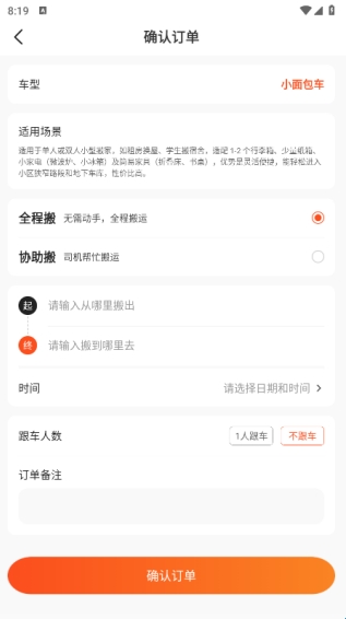 在确认订单页面中选择车型,全程搬或是协助搬,再选择地点和时间,跟车人数,再进行确订订单;