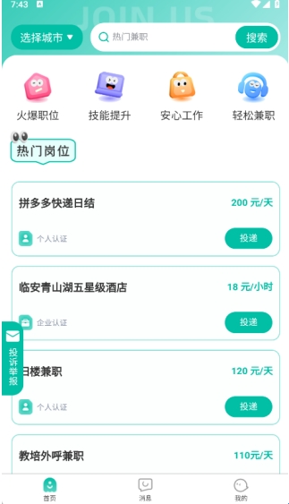 在首页中有火爆职位、技能提升、安心工作、轻松兼职等版块;