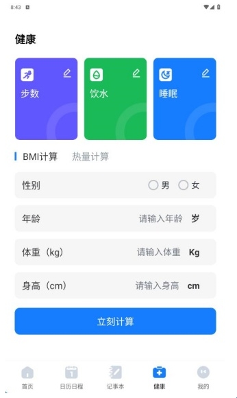 在健康页面,实时记录喝水、走路等健康管理信息,还有bmi计算功能,更直观了解减肥情况是否达标。