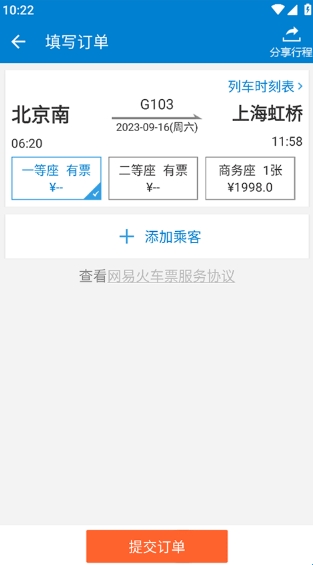在这里,用户需要先添加乘客,再选择座位,最后就可以选择并点击“提交订单”的按钮选项来下单了。