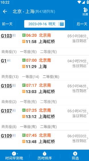 软件首页就会展示车次的查询入口,方便你快速查询,支持按出发时间、历时、价格排序查询