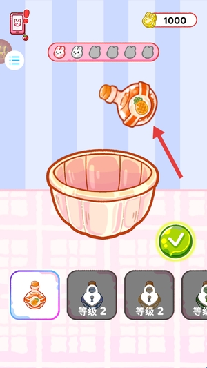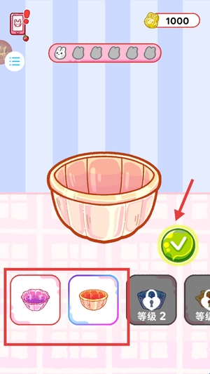 2、选择可用模具样式如粉色或橙色款,点击绿色对勾确认容器,进入下一步制作流程。