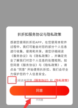 1、启动扒折扣应用,勾选同意服务协议与隐私政策后进入。