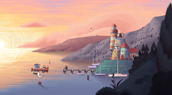 1、具有深意的场景绘画,有的是在黄昏中的海岸,有的是在坡道上的小镇。