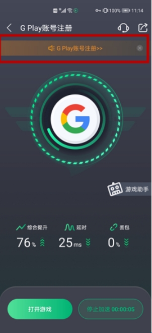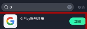 2、加速成功后点击上方红框处,“G play账号注册”。