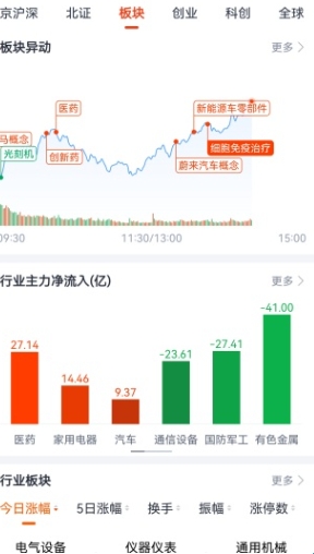 4、板块区能查看板块异动,还有行业主力净流入情况。