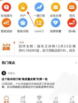 1、首先打开软件,然后在APP首页内选择“开户”功能,如下图所示;