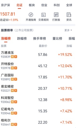 3、在北证板块,则能了解最新股票榜单,涨幅情况一目了然。