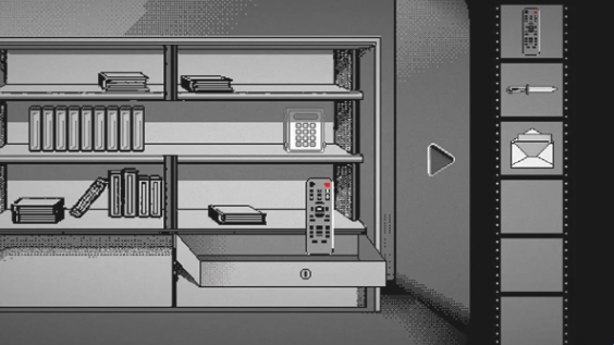 1、进入游戏后点击柜子上的书本,让所有书本浮起,获取钥匙,然后用钥匙开启柜子,获得遥控器,小刀,信。