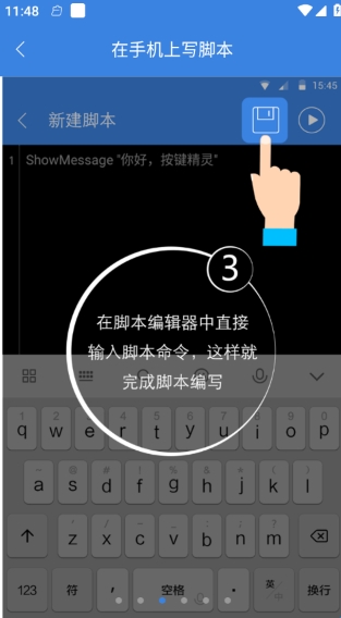 在编辑器中直接输入脚本命令,这样就完成脚本编写了,点击上方“保存”按钮即可。
