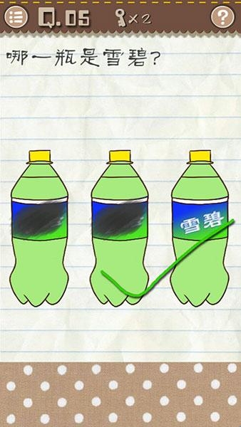 第5关、用手指在黑色的区域滑动抹去污渍,看到瓶子上的字,找到雪碧即可。
