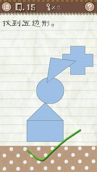 第15关、将三角形和长方形的两个图案组合起来就是五边形了。