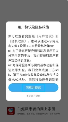 1、在本站下载打开白白手拉手,阅读弹出的用户协议及隐私政策,点击【同意并继续】;