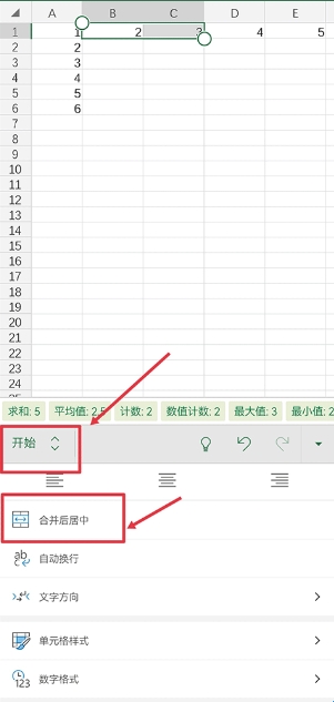 2、然后在开始界面中点击合并后居中功能
