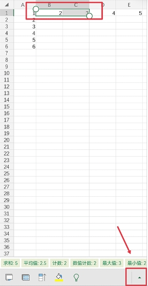 1、在表格中将两个或两个以上的单元格选中,并点击菜单栏右边的箭头