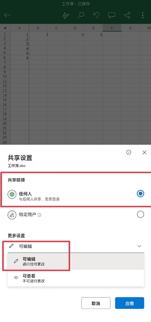 3、然后将权限设置为与任何人共享,可编辑的状态