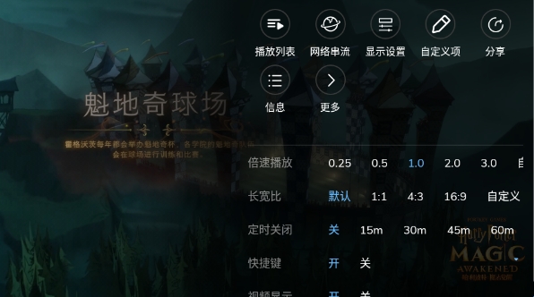 播放过程中点击菜单键会弹出操作菜单,在“显示”一项中包含了常用的显示设置。如屏幕方向、触摸动作和屏幕显示信息等。用户还可以设置跳转时间间隔及拖动支持的操作。