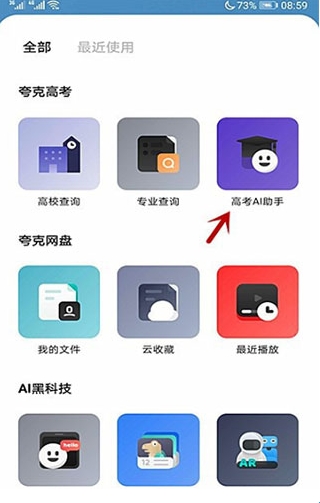 点击打开夸克高考版,然后点击页面上的“高考Al助手”;