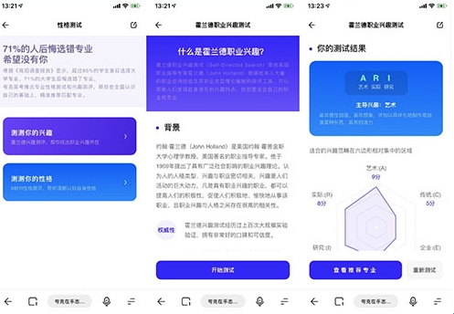 看到一堆专业,不知道如何选择,在软件中通过独特的性格测试来判断你适合什么样的专业。