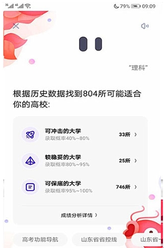 然后如实回答“哪的考生、高考科目”后,就可以查看可冲击的大学、较稳妥的大学、可保底的大学。