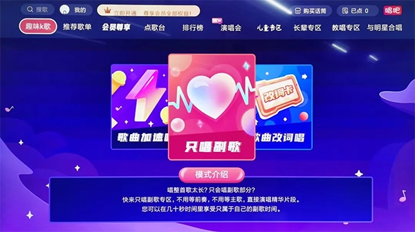 唱整首太长?只会唱副歌部分?不想唱前奏?副歌部分对演唱功力要求更高,想要勤加练习?想唱更多热歌,发布社交平台吸引流量?针对这类问题,唱吧TV端在基于对各类短视频平台的K歌数据和对用户功能使用喜好调研的基础上,优先选取现在宝子们最喜爱的热门歌曲,全新推出了「只唱副歌」专区。