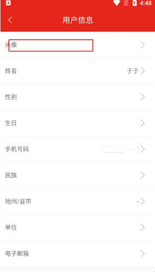 在该页面完善用户信息,如头像、名字、地区、单位,我们头像;